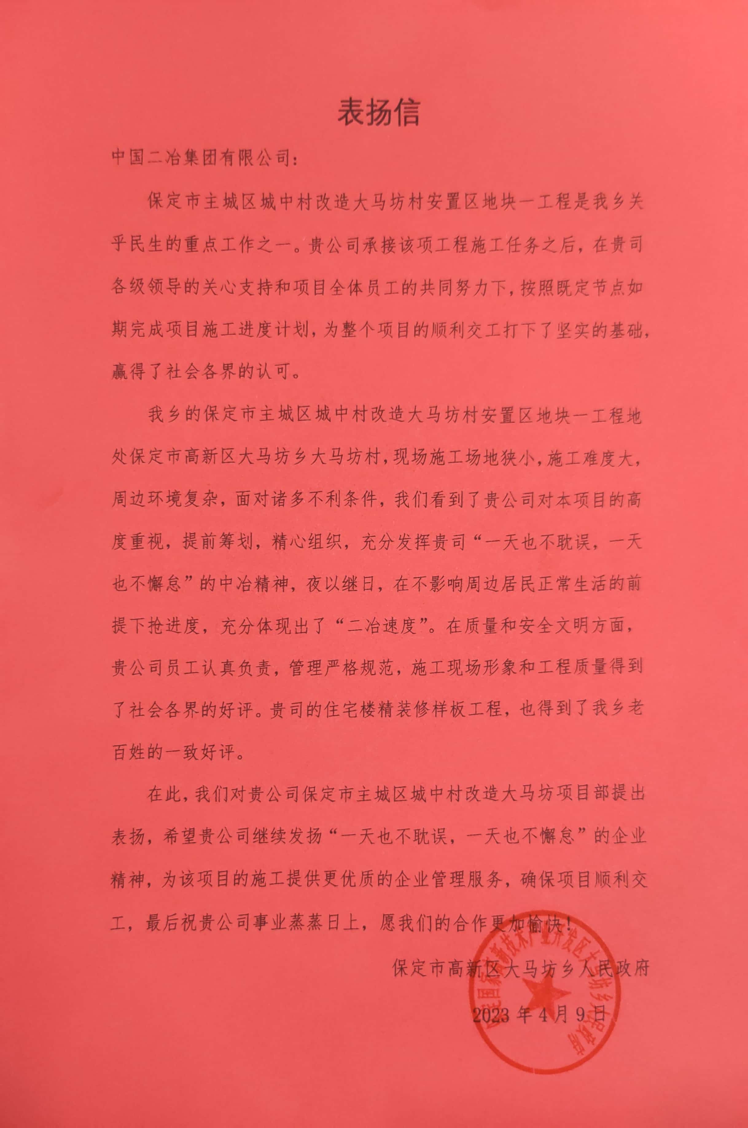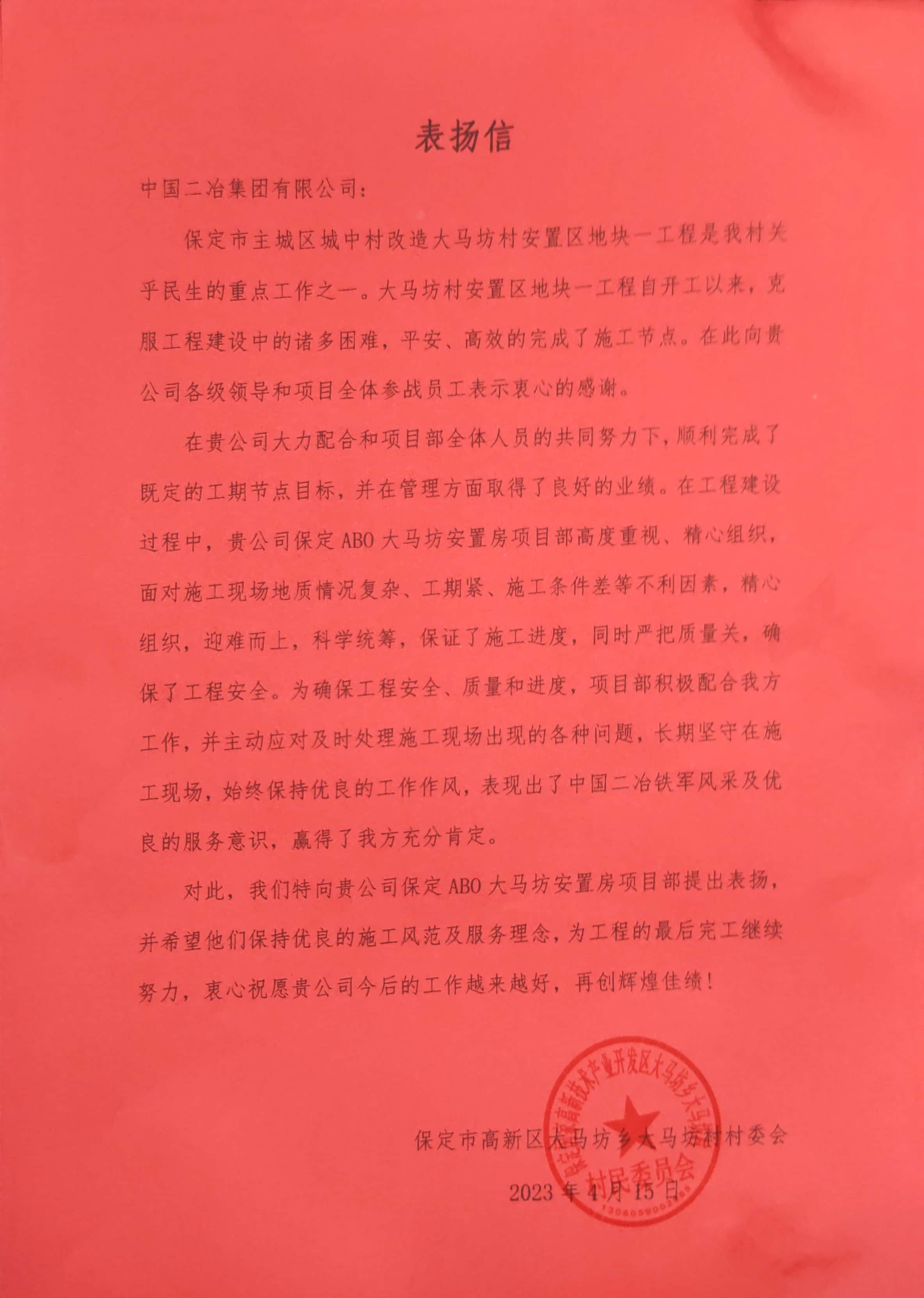 近日,中國二冶房地產(chǎn)公司承建的保定ABO二期大馬坊項目部分別收到來自大馬坊村委會及大馬坊鄉(xiāng)政府的兩封表揚信。