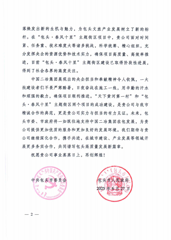 6月30日,中國二冶收到包頭市委、市政府發(fā)來的表揚(yáng)信,對(duì)中國二冶在“天下黃河第一村”和“包頭?春風(fēng)十里”兩大重點(diǎn)文旅項(xiàng)目建設(shè)中作出的卓越貢獻(xiàn),給予高度贊譽(yù)。?