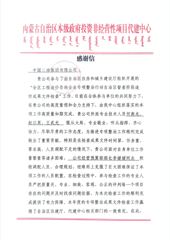 近日,中國二冶收到內(nèi)蒙古自治區(qū)本級政府投資非經(jīng)營性項目代建中心的感謝信,信中對公司在全區(qū)工程造價咨詢企業(yè)專項整治行動中的突出表現(xiàn)給予高度肯定,彰顯了駐自治區(qū)建筑央企的專業(yè)實力與責(zé)任擔(dān)當(dāng)。