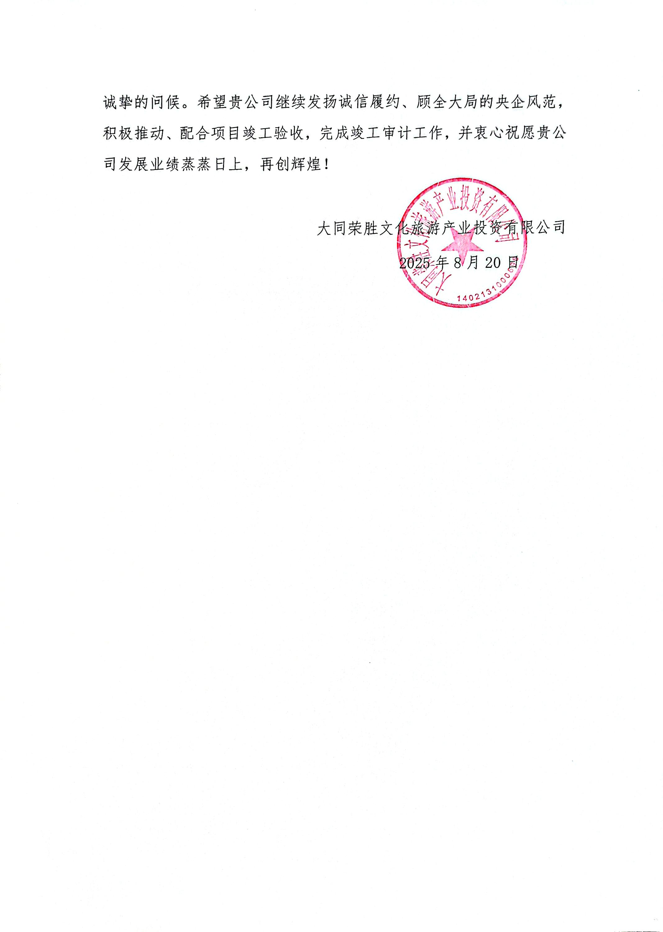 8月21日,中國(guó)二冶收到大同榮勝文化旅游產(chǎn)業(yè)投資有限公司發(fā)來(lái)的表?yè)P(yáng)信,信中對(duì)中國(guó)二冶內(nèi)蒙古分公司在項(xiàng)目建設(shè)中的卓越表現(xiàn)給予高度認(rèn)可。?
