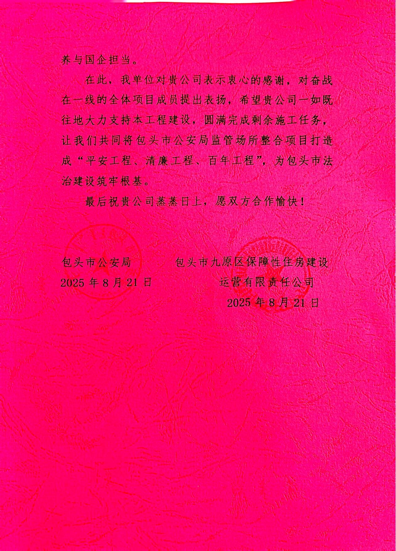 信中指出,貴公司作為總承包單位,充分發(fā)揮協(xié)調(diào)樞紐作用,高效對(duì)接設(shè)計(jì)、監(jiān)理及分包單位,妥善解決現(xiàn)場(chǎng)技術(shù)爭(zhēng)議,使項(xiàng)目使用功能更加符合實(shí)際需求,確保工程高效推進(jìn)。同時(shí)嚴(yán)格執(zhí)行國(guó)家安全文明施工規(guī)范,全程“零事故”施工;對(duì)監(jiān)區(qū)墻體結(jié)構(gòu)、防逃設(shè)施等關(guān)鍵工序精益求精,質(zhì)量達(dá)標(biāo),為包頭市的公共安全事業(yè)發(fā)展做出了重要貢獻(xiàn)。今年,在外網(wǎng)配套工程中標(biāo)后,貴公司第一時(shí)間響應(yīng),相關(guān)領(lǐng)導(dǎo)高度重視,多次與我單位進(jìn)行洽商會(huì)談,項(xiàng)目團(tuán)隊(duì)迅速行動(dòng),人、材、機(jī)第一時(shí)間到位,形成了大干快上的良好局面,項(xiàng)目團(tuán)隊(duì)展現(xiàn)的 “超越自我、挑戰(zhàn)極限”的作風(fēng),以及使命必達(dá)的執(zhí)行力,深刻詮釋了專業(yè)素養(yǎng)與國(guó)企擔(dān)當(dāng)。
