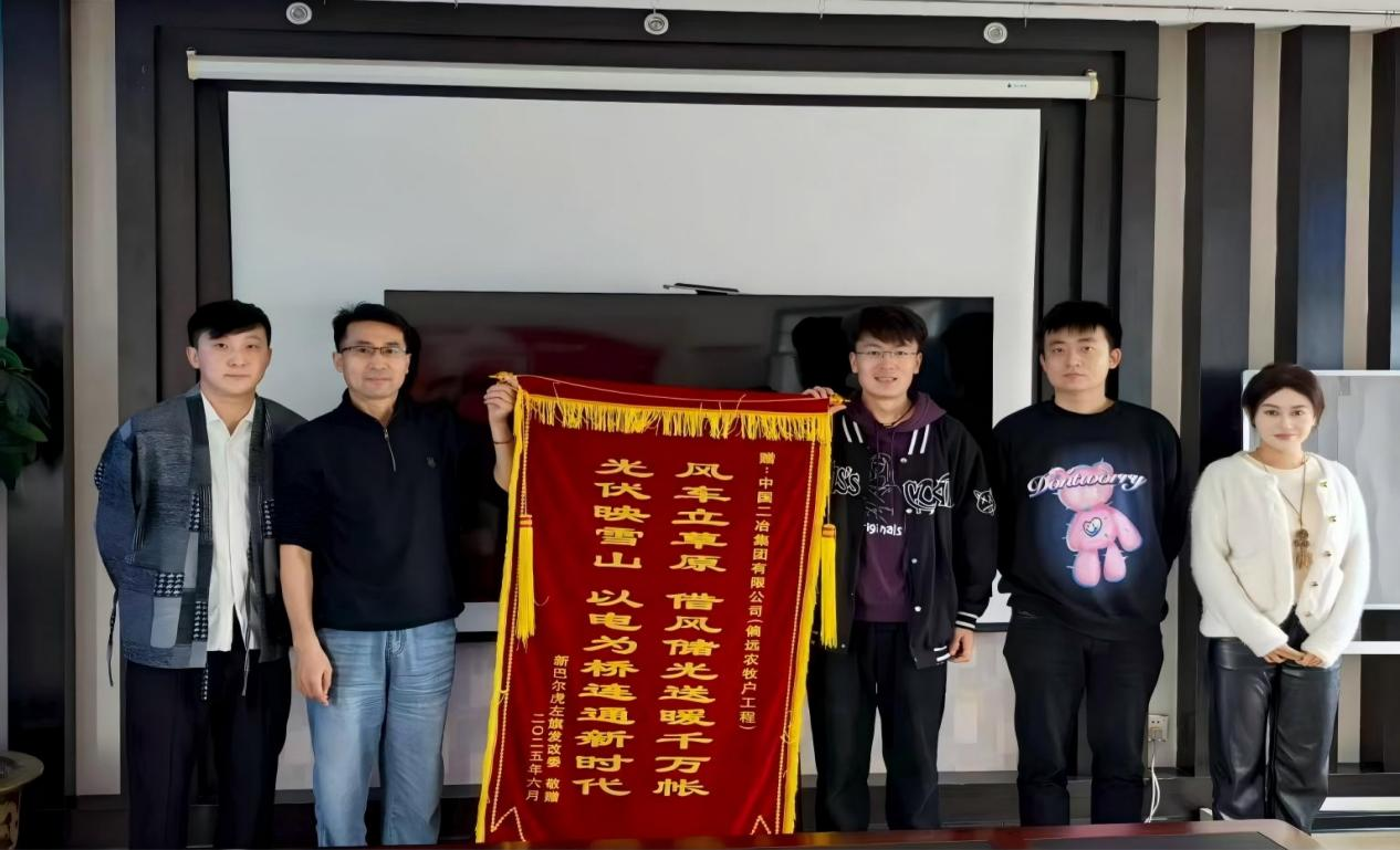錦旗上題寫“風(fēng)車立草原,借風(fēng)儲(chǔ)光送暖千萬帳;光伏映雪山,以電為橋連通新時(shí)代”,生動(dòng)詮釋了項(xiàng)目的核心價(jià)值與深遠(yuǎn)意義。新巴爾虎左旗政府表示,該項(xiàng)目地處內(nèi)蒙古偏遠(yuǎn)牧區(qū),氣候條件惡劣、交通出行不便,整體施工環(huán)境極為艱苦。面對挑戰(zhàn),項(xiàng)目管理團(tuán)隊(duì)充分發(fā)揮技術(shù)與管理優(yōu)勢,始終以“高標(biāo)準(zhǔn)、高質(zhì)量、高效率”為施工準(zhǔn)則,全力克服物資運(yùn)輸困難、極端天氣影響等多重難題,最終如期完成節(jié)點(diǎn)任務(wù)。該項(xiàng)目的順利推進(jìn),不僅成功解決了當(dāng)?shù)剞r(nóng)牧民的急難愁盼問題,直接惠及數(shù)百戶農(nóng)牧民家庭,顯著提升了牧區(qū)群眾的生活品質(zhì);更通過產(chǎn)業(yè)配套升級,為當(dāng)?shù)亟?jīng)濟(jì)可持續(xù)發(fā)展注入了新動(dòng)能,為邊疆牧區(qū)發(fā)展奠定了堅(jiān)實(shí)基礎(chǔ)。