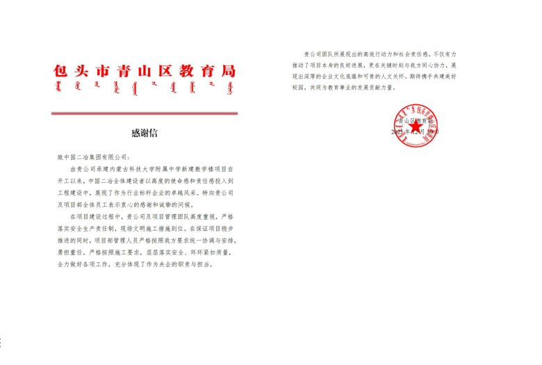 近日,中國(guó)二冶收到包頭市青山區(qū)教育局發(fā)來(lái)的感謝信,信中對(duì)中國(guó)二冶在內(nèi)蒙古科技大學(xué)附屬中學(xué)新建教學(xué)樓項(xiàng)目中展現(xiàn)的高度使命感及責(zé)任感表示高度贊揚(yáng)。