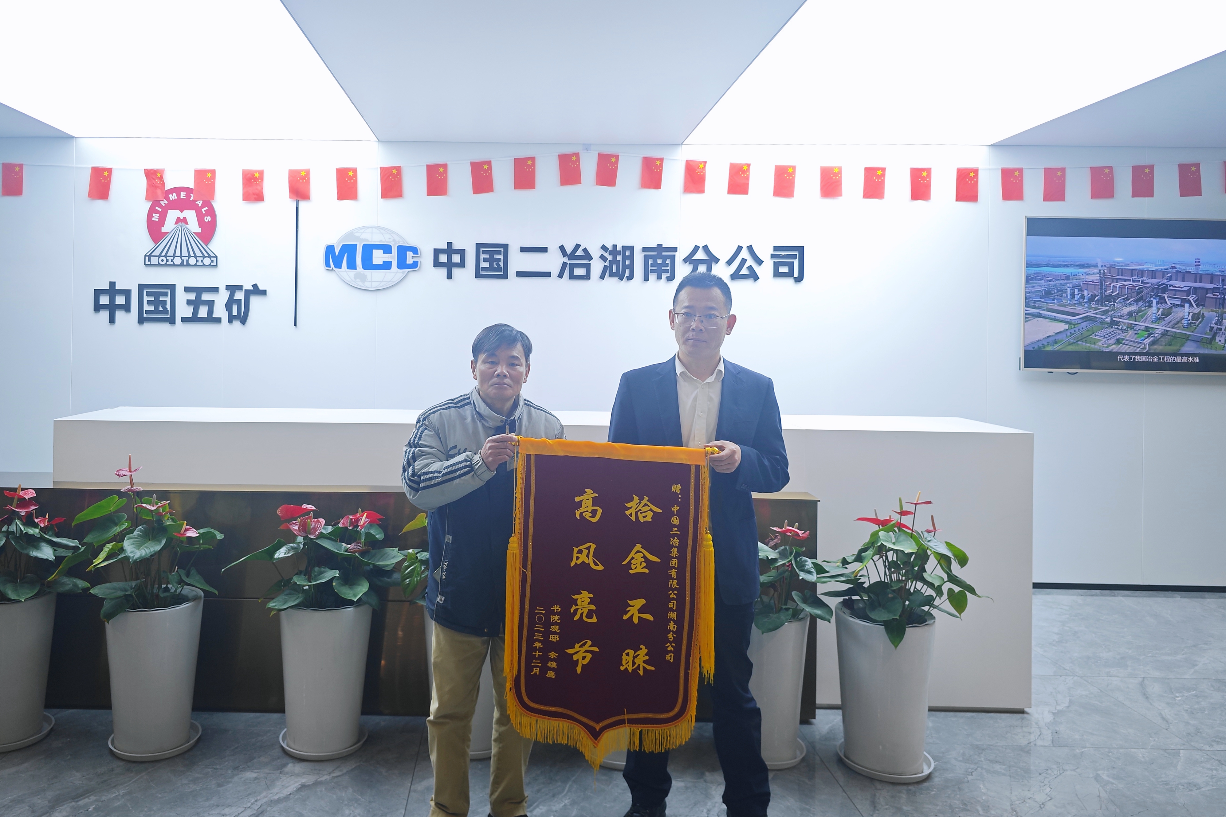 12月29日,長沙市書院觀邸小區(qū)居民佘先生將一面印有“拾金不昧 高風(fēng)亮節(jié)”的錦旗送到了湖南分公司,對中國二冶湖南分公司職工郭振華拾金不昧的善舉表示感謝。