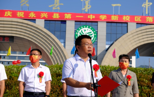 揭牌儀式首先由永興一中校長(zhǎng)胡兆文致辭。他指出,永興一中項(xiàng)目建設(shè)是造福當(dāng)?shù)匕傩盏囊豁?xiàng)重大民生工程,是功在當(dāng)代,利在千秋的一件大事。他希望學(xué)生們心懷天下做有家國(guó)情懷的人,意志堅(jiān)韌做積極進(jìn)取的人,心胸開闊做陽(yáng)光大度的人,心存善意做助人為樂(lè)的人。最后,他祝學(xué)生們?cè)谛碌膶W(xué)校快樂(lè)成長(zhǎng)。