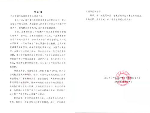 10月29日,中國二冶收到一封來自眉山市仁壽縣高家鎮(zhèn)石青村村民委員會(huì)的感謝信。