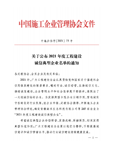 中國(guó)工程建設(shè)誠(chéng)信典型企業(yè)由中國(guó)施工企業(yè)管理協(xié)會(huì)信用評(píng)價(jià)工作委員會(huì)組織實(shí)施,評(píng)估周期為一年。其目的旨在倡導(dǎo)企業(yè)誠(chéng)信經(jīng)營(yíng)并對(duì)工程建設(shè)行業(yè)運(yùn)營(yíng)規(guī)范、信譽(yù)良好、社會(huì)責(zé)任感強(qiáng)的誠(chéng)信企業(yè)給予激勵(lì)與褒獎(jiǎng),發(fā)揮好誠(chéng)信典型示范引領(lǐng)作用。