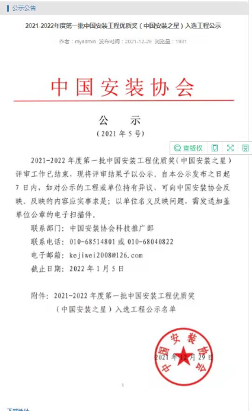 中國安裝之星于1998年經(jīng)建設(shè)部批準(zhǔn)設(shè)立,是由中國安裝協(xié)會組織實施的安裝行業(yè)的獎項。該獎項的評選內(nèi)容主要側(cè)重于安裝技術(shù)和施工絕活。該獎項設(shè)立以來,對安裝企業(yè)的科技創(chuàng)新、技術(shù)提高和技術(shù)推廣起到了很好的推動作用。
