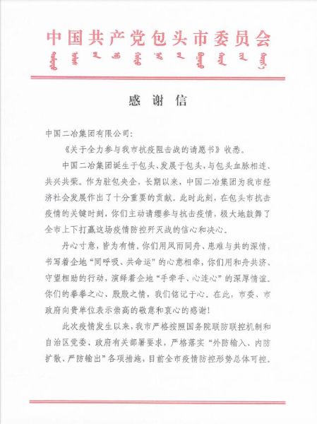 感謝信中指出,中國(guó)二冶集團(tuán)誕生于包頭、發(fā)展于包頭,與包頭血脈相連、共興共榮。作為駐包央企,長(zhǎng)期以來(lái),中國(guó)二冶集團(tuán)為包頭市經(jīng)濟(jì)社會(huì)發(fā)展作出了十分重要的貢獻(xiàn)。在包頭市抗擊疫情的關(guān)鍵時(shí)刻,主動(dòng)請(qǐng)纓參與抗擊疫情,極大地鼓舞了全市上下打贏(yíng)這場(chǎng)疫情防控殲滅戰(zhàn)的信心和決心。