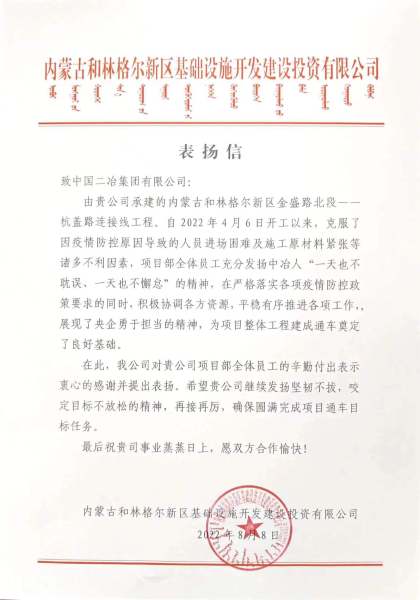 8月8日,內(nèi)蒙古和林格爾新區(qū)基礎(chǔ)設(shè)施開發(fā)建設(shè)投資有限公司向中國二冶發(fā)來表揚(yáng)信,對中國二冶項目建設(shè)團(tuán)隊專業(yè)水平表示肯定,對內(nèi)蒙古和林格爾新區(qū)金盛路北段--杭蓋路連接線工程施工建設(shè)進(jìn)程表示高度贊揚(yáng)。